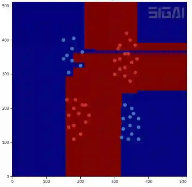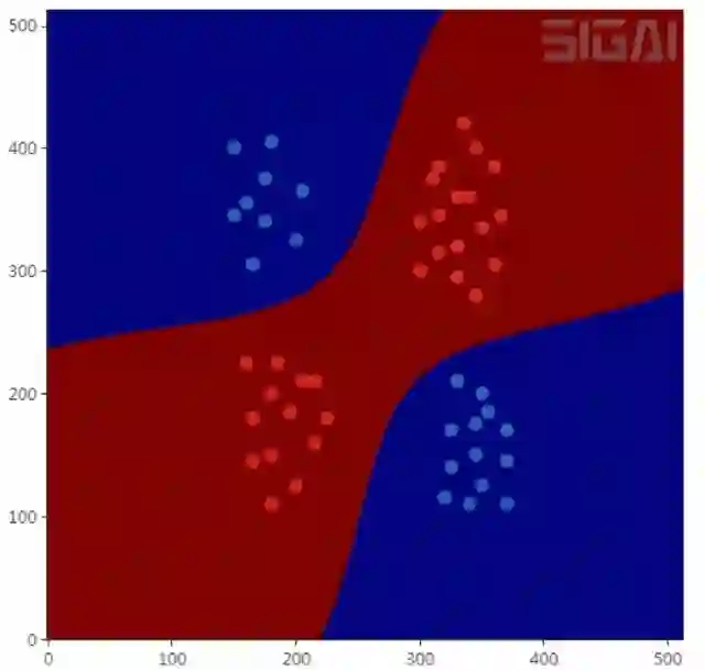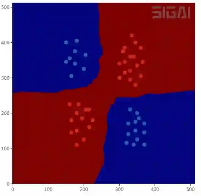 然后用梯度下降法更新。神经网络是一个判别模型,并且是非线性模型,它既支持分类问题,也支持回归问题,并且支持多分类问题。下图是用神经网络对异或问题的分类结果: