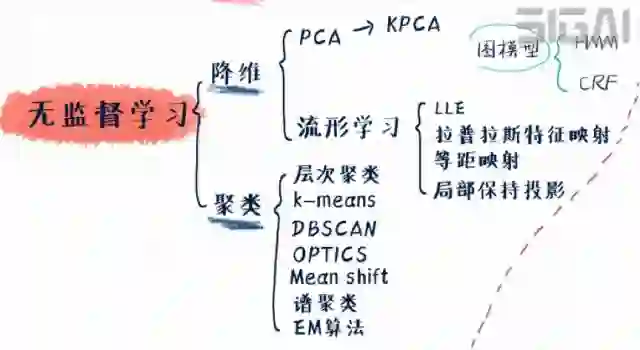 接下来说无监督学习,它可以分为数据降维算法和聚类算法两大类。演变关系如下图所示: