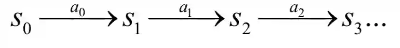 立即回报和当前状态、当前采取的动作以及下一时刻进入的状态有关。在每个时刻t,智能体选择一个动作at执行,之后进入下一状态st+1,环境给出回报值。智能体从某一初始状态开始,每个时刻选择一个动作执行,然后进入下一个状态,得到一个回报,如此反复: