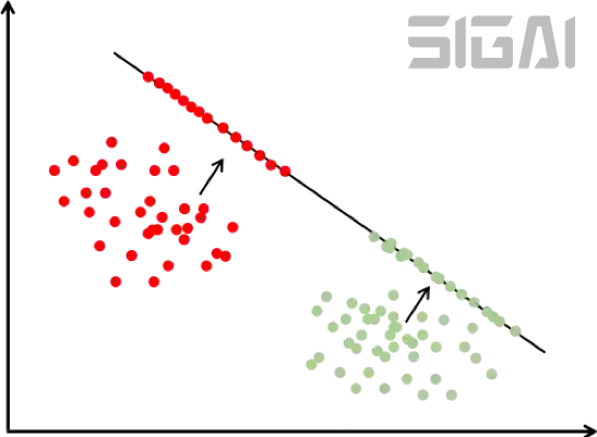 投影的目标是同一类样投影后的结果向量差异尽可能小,不同类的样本差异尽可能大。直观来看,就是经过这个投影之后同一类的样本进来聚集在一起,不同类的样本尽可能离得远。下图是这种投影的示意图:
