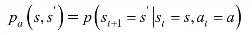 其中S和A分别为状态和动作的集合。假设t时刻状态为st,智能体执行动作a,下一时刻进入状态st+1。下一时刻的状态由当前状态以及当前采取的动作决定,是一个随机性变量,这一状态转移的概率为: