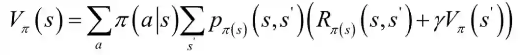 如果每次执行一个动作进入的下一个状态是确定的,则可以直接用上面的累计回报计算公式。如果执行完动作后进入的下一个状态是随机的,则需要计算各种情况的数学期望。为此定义状态价值函数的概念,它是在某个状态s下,按照策略执行动作,累计回报的数学期望。状态价值函数的计算公式为: