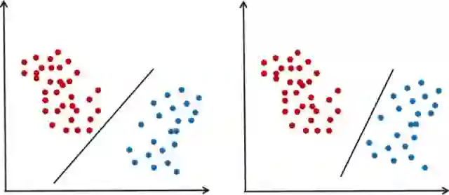 支持向量机是对线性分类器的改进,加上了最大化分类间隔的约束,另外还使用了核技术,通过非线性核解决非线性问题。一般情况下,给定一组训练样本可以得到不止一个可行的线性分类器,下图就是一个例子: