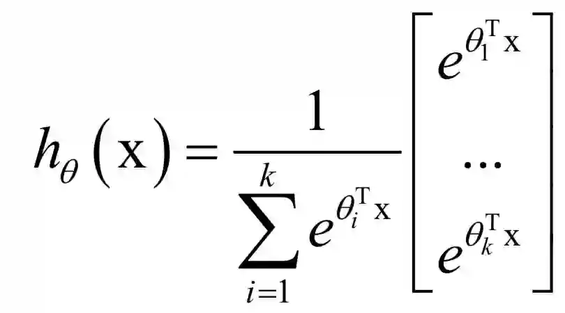 logistic回归只能用于二分类问题,将它进行推广可以得到处理多类分类问题的softmax回归。softmax回归按照下面的公式估计一个样本属于每一类的概率: