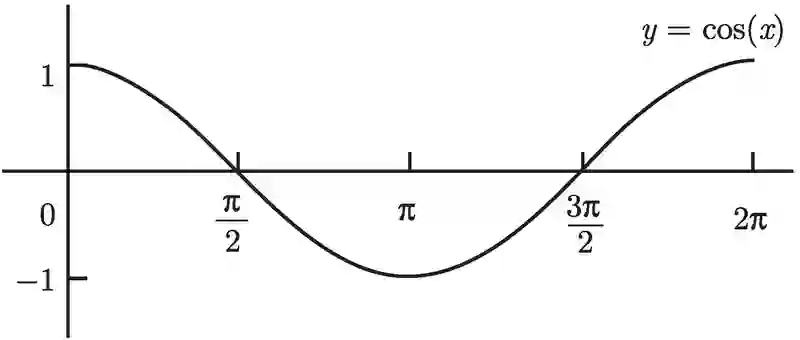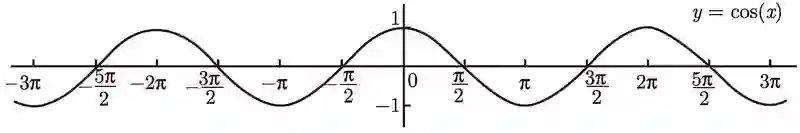 例如, 如果你想要求 cos (π), 只需从图像上读取, 你会看到结果是 -1. 此外, 注意到该图像关于 y 轴有镜面对称性. 这说明, cos (x) 是 x 的偶函数.