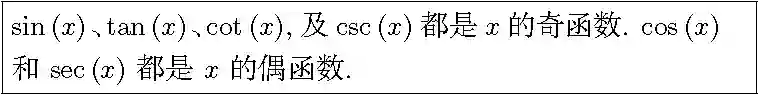 因此, 对于所有的实数 x, 我们有 sin (-x) = -sin (x), tan (-x) = -tan (x), cos (-x) = cos (x).