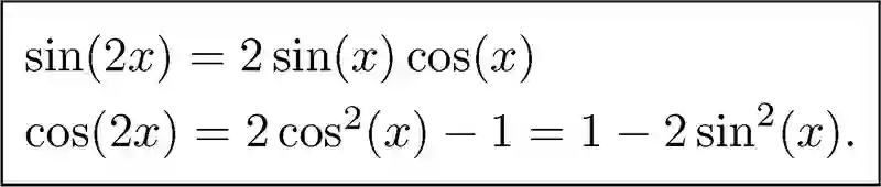 对于上述方框公式中的 sin (A + B) 和 cos (A + B), 令 A = B = x, 我们就会得到另一个有用的结果. 很明显, 正弦公式是 sin (2x) = 2 sin (x) cos (x). 但让我们更仔细看一下余弦公式. 它会变成 cos (2x) = cos2 (x) - sin2 (x); 这本身没错, 但更有用的是使用毕达哥拉斯定理 sin2 (x) + cos2 (x) = 1 将 cos (2x) 表示成为 2 cos2 (x) - 1 或 1 - 2 sin2 (x) (自已验证一下它们是成立的!). 综上, 倍角公式为: