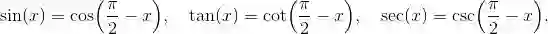 甚至当三角函数名中已经带有一个 “co” 时, 以上公式仍然适用; 你只需要认识到, 余角的余角就是原始的角! 例如, co-co-sin 事实上就是 sin, co-co-tan 事实上就是 tan. 基本上, 这意味着我们还可以说:
