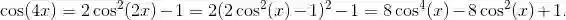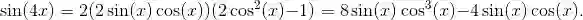 那么如何用 sin (x) 和 cos (x) 来表示 sin (4x) 呢?我们可以将 4x 看作两倍的 2x, 并使用正弦恒等式, 写作 sin (4x) = 2 sin (2x) cos (2x). 然后应用两个恒等式, 得到