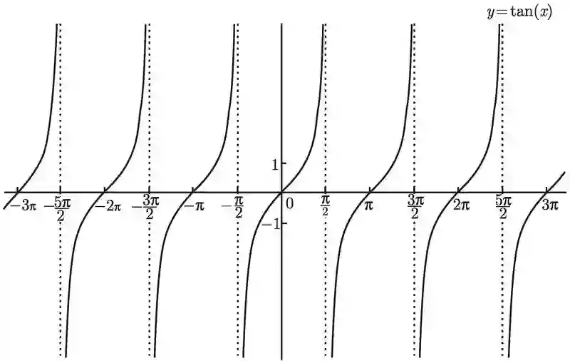 与正弦函数和余弦函数不同的是, 正切函数有垂直渐近线. 此外, 它的周期是 π, 而不是 2π. 因此, 上述图样可以被重复以便得到 y = tan (x) 的全部图像, 如图 2-19 所示.