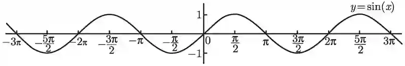 你应该做到能够不假思索就画出这个图像, 包括 0, π/2, π, 3π/2 和 2π 的位置. 由于 sin (x) 以 2π 为单位重复 (我们说 sin (x) 是 x的周期函数, 其周期为 2π), 通过重复该模式, 我们可以对图像进行扩展, 得到图 2-15.