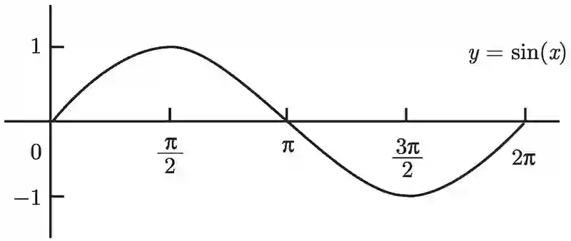 记住正弦、余弦和正切函数的图像会非常有用. 这些函数都是周期的, 这意味着, 它们从左到右反复地重复自己. 例如, 我们考虑 y = sin (x). 从 0 到 2π 的图像看上去如图 2-14 所示.