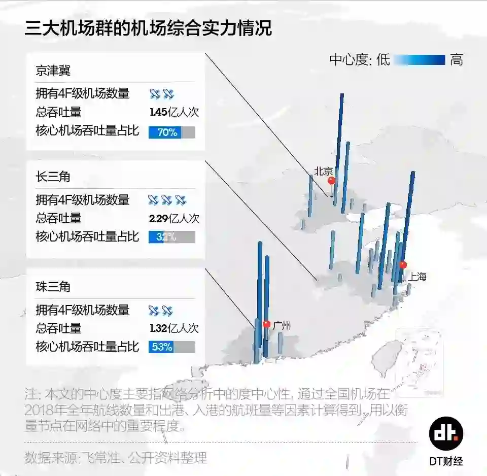 将研究视角放到更宽,DT君发现,又一座超大型机场建成背后,是城市群的经济辐射力在掰手腕。