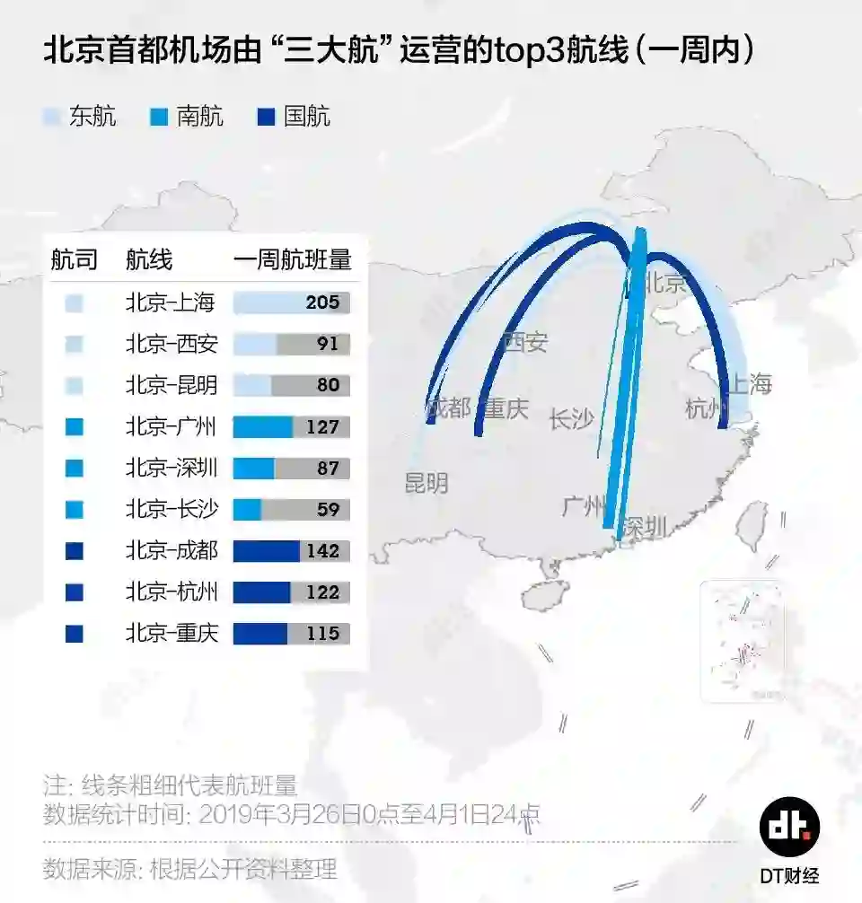 东航最吃重的航线为北京-上海航线,这条航线的航班量远远超出东航在首都机场的其他运营航线。南航则是北京-广州线和北京-深圳线打头阵。相对于东航和南航为帝都传输着与长三角、珠三角核心城市的人与货,国航的航线则分担在西南的成都、重庆和华东的杭州。