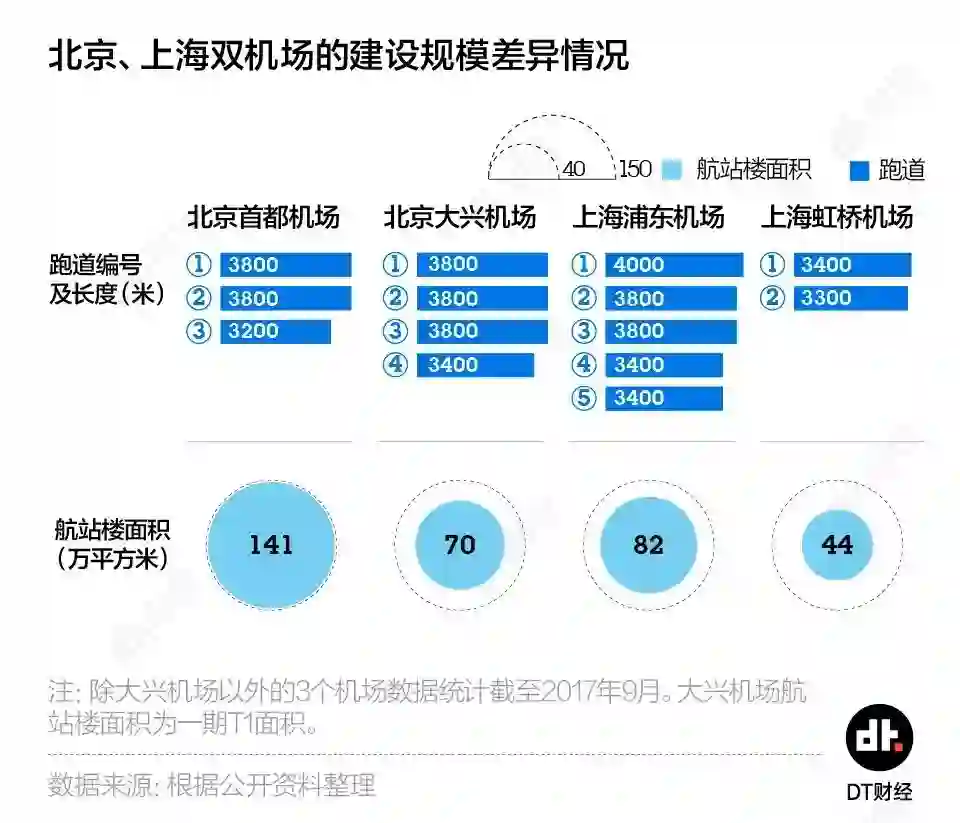 在建设规模上,大兴机场一口气建设了4条跑道,其中有3条跑道都达到3800米的长度,略微领先于首都机场。
