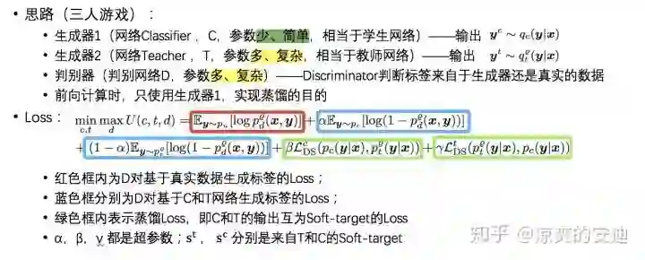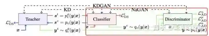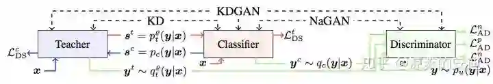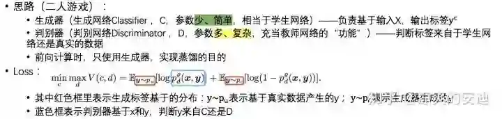 用对抗生成的方式模拟蒸馏的过程:生成器(学生网络,参数少、简单)负责基于输入X输出X的标签Y,判别器(教师网络,参数多、复杂)判断标签来自于学生网络还是真实的数据