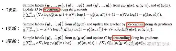 训练S:固定D和T,最小化损失函数。损失函数分为两部分,第一部分为判别器D对于S生成的标签真实性的判别,S希望D判别的概率越小越好;第二部分为蒸馏Loss,S网络去拟合T网络输出的软目标。