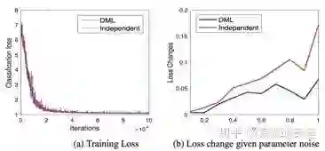深度互学习的方法可能找到了更平缓的极值点(意味着泛化能力更强,小的波动不会对预测产生较大的影响),如下图所示,DML网络的Loss和单独训练网络Loss接近,但是,当对参数添加噪声时,DML的Loss小于单独训练的Loss(当网络输出对于输入噪声的敏感程度比较差的时候,可以认为网络输出处于一个比较平缓的局部最优点)。