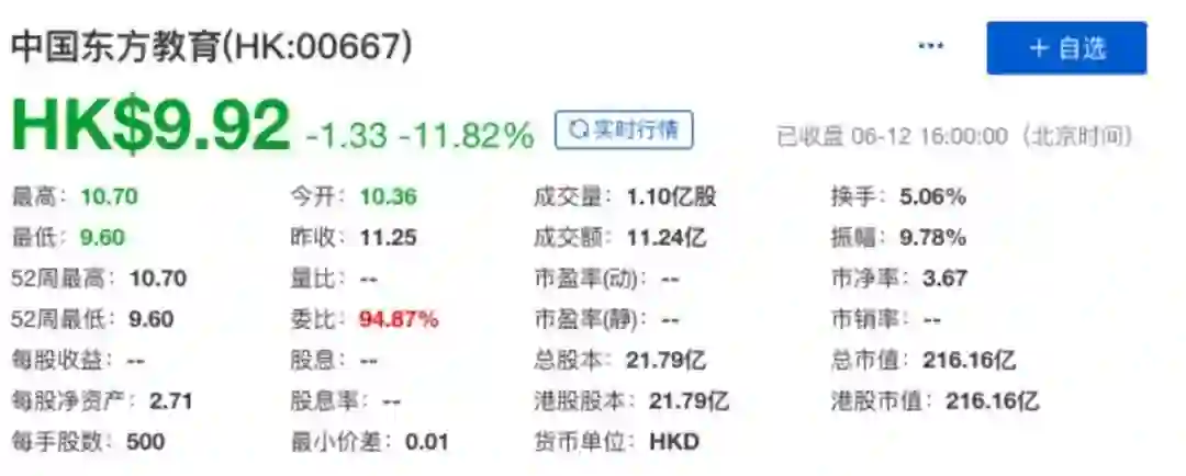 但在首日,东方教育却遭开盘滑铁卢,低开7.91%,报10.36港元。截至昨日(6月12日)收盘,股价报9.92港元,跌幅11.822%,市值216.16亿港元。