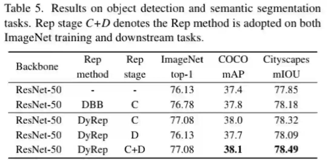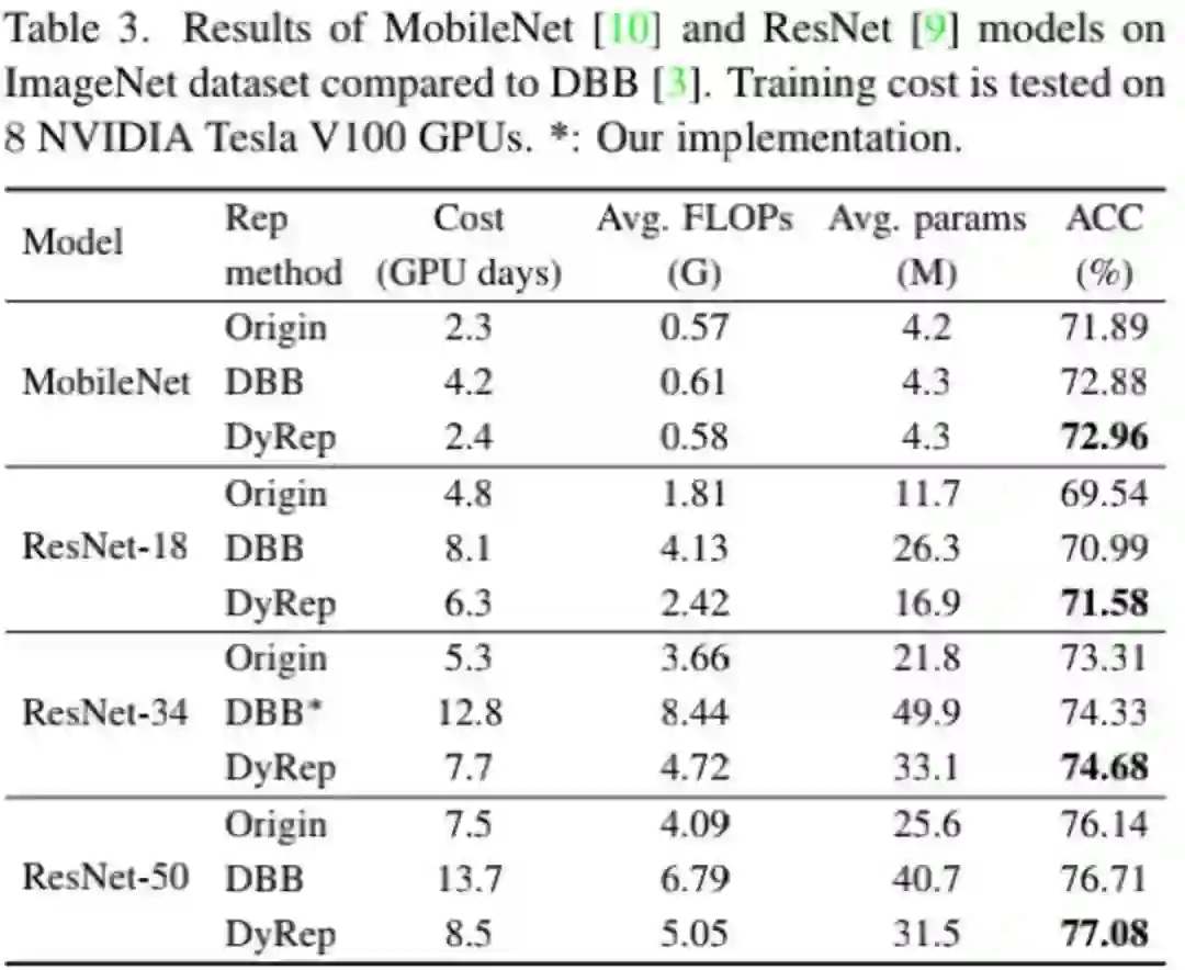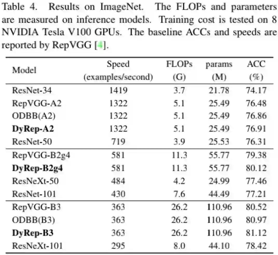 上表给出了ImageNet+ResNet基线上DBB与DyRep的性能对比,从中可以看到:相比DBB,所提方案可以取得显著性能提升,同时需要训练耗时更短。