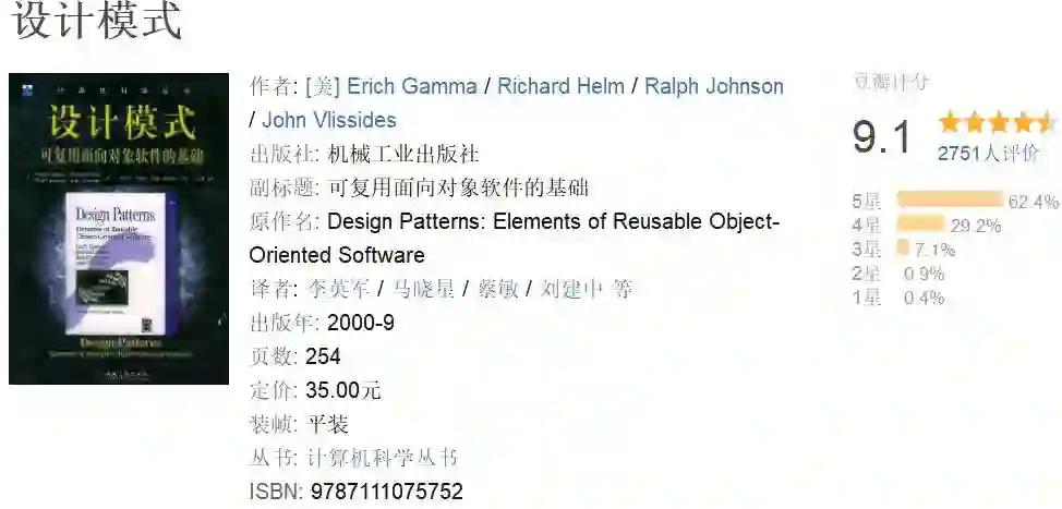 这本书主要帮助你了解什么是设计模式,以及介绍你的职业生涯中最常见的设计模式,读起来可能不是特别容易,书中的描述和例子都有点难理解,但我认为这是一本“必读”书籍,如果你觉得这本书对你有难度,那建议你从《Head First 设计模式》开始,书中的内容比较浅显易懂。