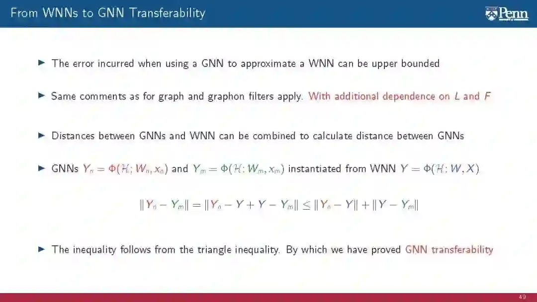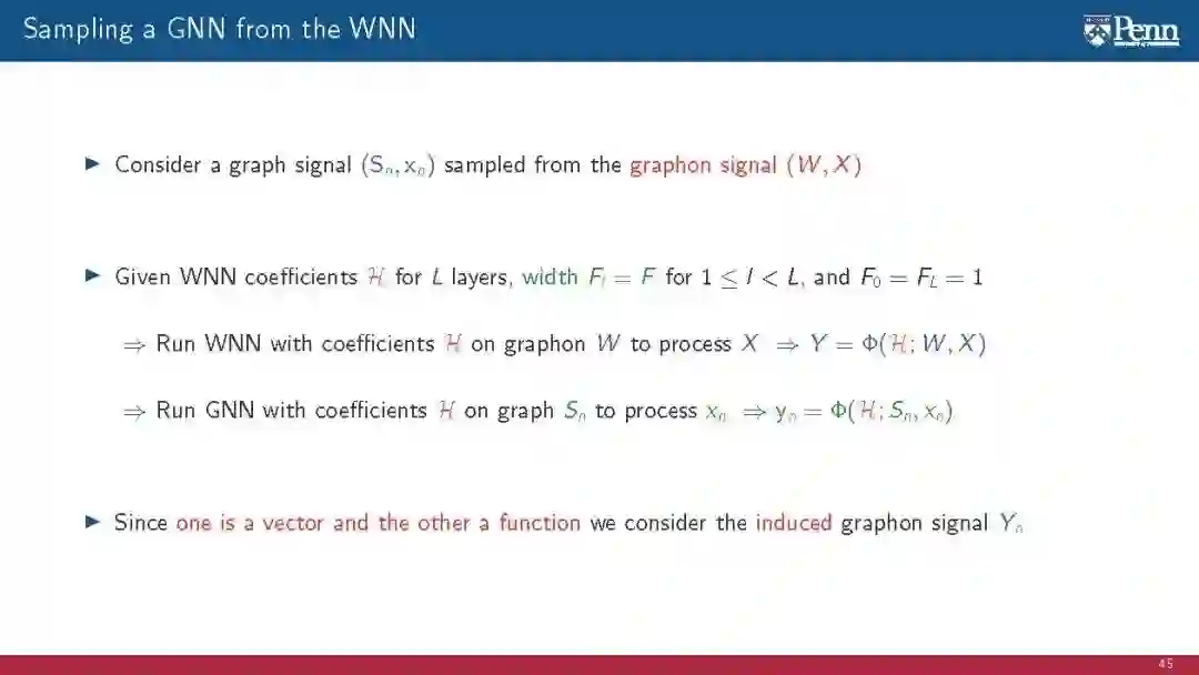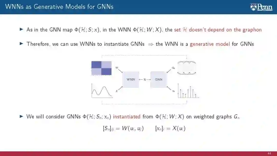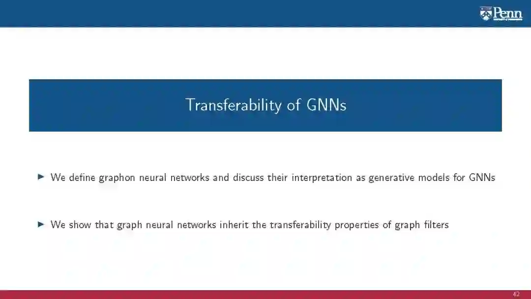 在这节课中,我们将讨论GNN的可迁移性,也就是说能够在保证性能的情况下迁移机器学习模型。首先,我们深入研究了谱域和节点域的graphon滤波器的收敛性。稍后,我们将以生成模型的形式讨论graphon过滤器。我们将继续介绍graphon 神经网络(WNNs),这是解释为什么graphon 神经网络可以在从graphon 获得的确定性图之间转换的关键元素。我们最后证明GNN继承了图滤波器的可迁移性。