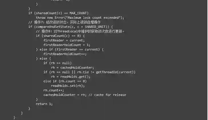 操作8:同操作4,获取成功后再ThreadLocal中记录当前线程获取读锁的次数。