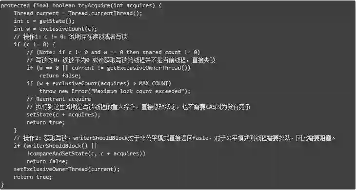 写锁的获取也主要是tryAcquire(arg)方法,这里也拆解步骤: