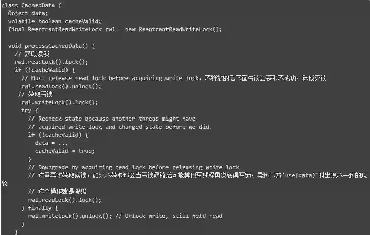 那么锁降级有什么用?答案是为了可见性的保证。在ReentrantReadWriteLock的javadoc中有如下代码,其是锁降级的一个应用示例。