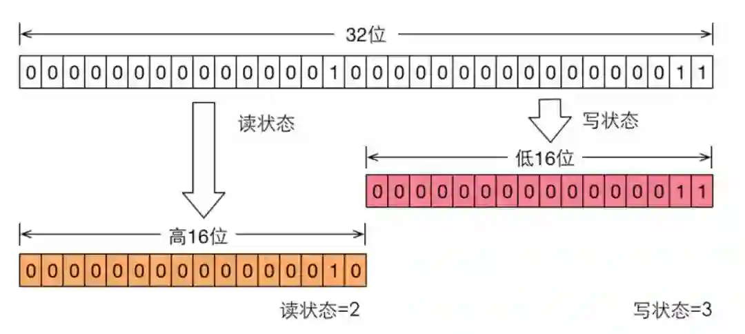 从代码中获取读写状态可以看出其是把state(int32位)字段分成高16位与低16位,其中高16位表示读锁个数,低16位表示写锁个数,如下图所示(图来自Java并发编程艺术)。