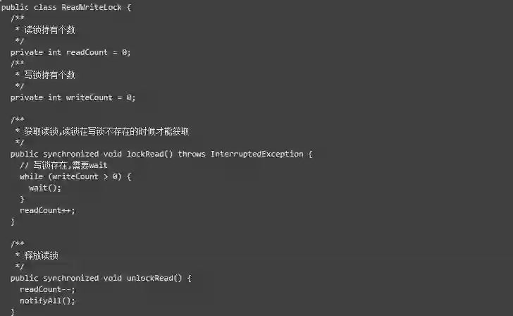 根据上面理论可以利用两个int变量来简单实现一个读写锁,实现虽然烂,但是原理都是差不多的,值得阅读下。