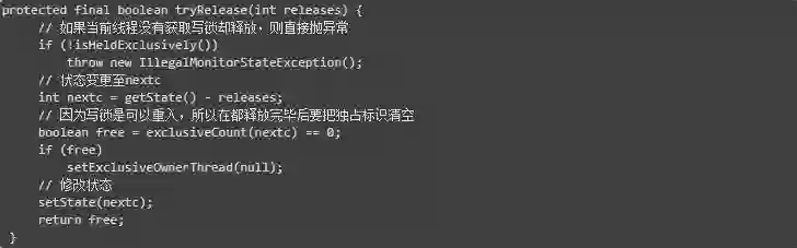 写锁的释放主要是tryRelease(arg)方法,其逻辑就比较简单了,注释很详细。