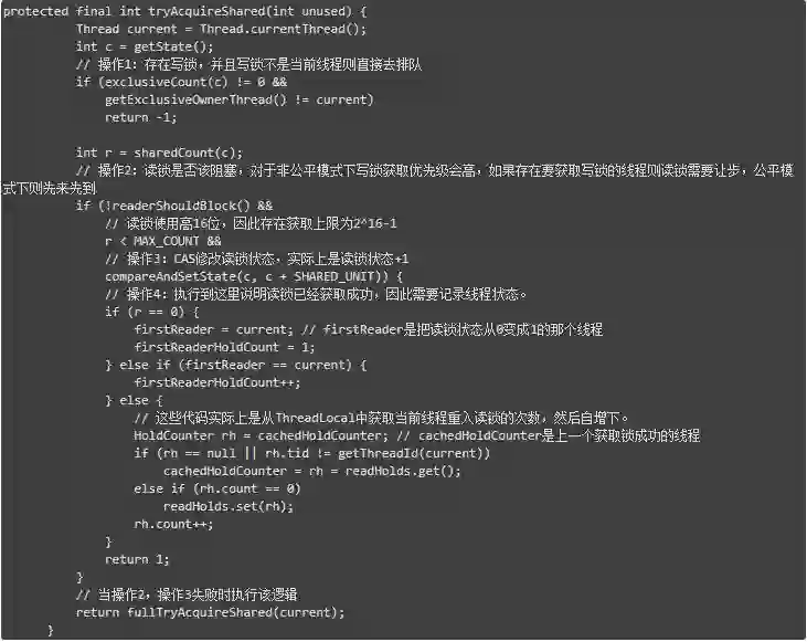 读锁的获取主要实现是AQS中的acquireShared方法,其调用过程如下代码。