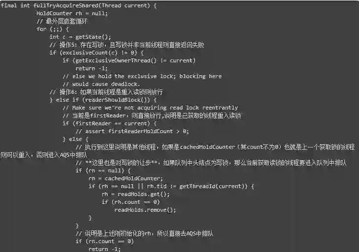 当操作2,操作3失败时会执行fullTryAcquireShared(current),为什么会这样写呢?个人认为是一种补偿操作,操作2与操作3失败并不代表当前线程没有读锁的资格,并且这里的读锁是共享锁,有资格就应该被获取成功,因此给予补偿获取读锁的操作。在fullTryAcquireShared(current)中是一个循环获取读锁的过程,大致步骤如下: