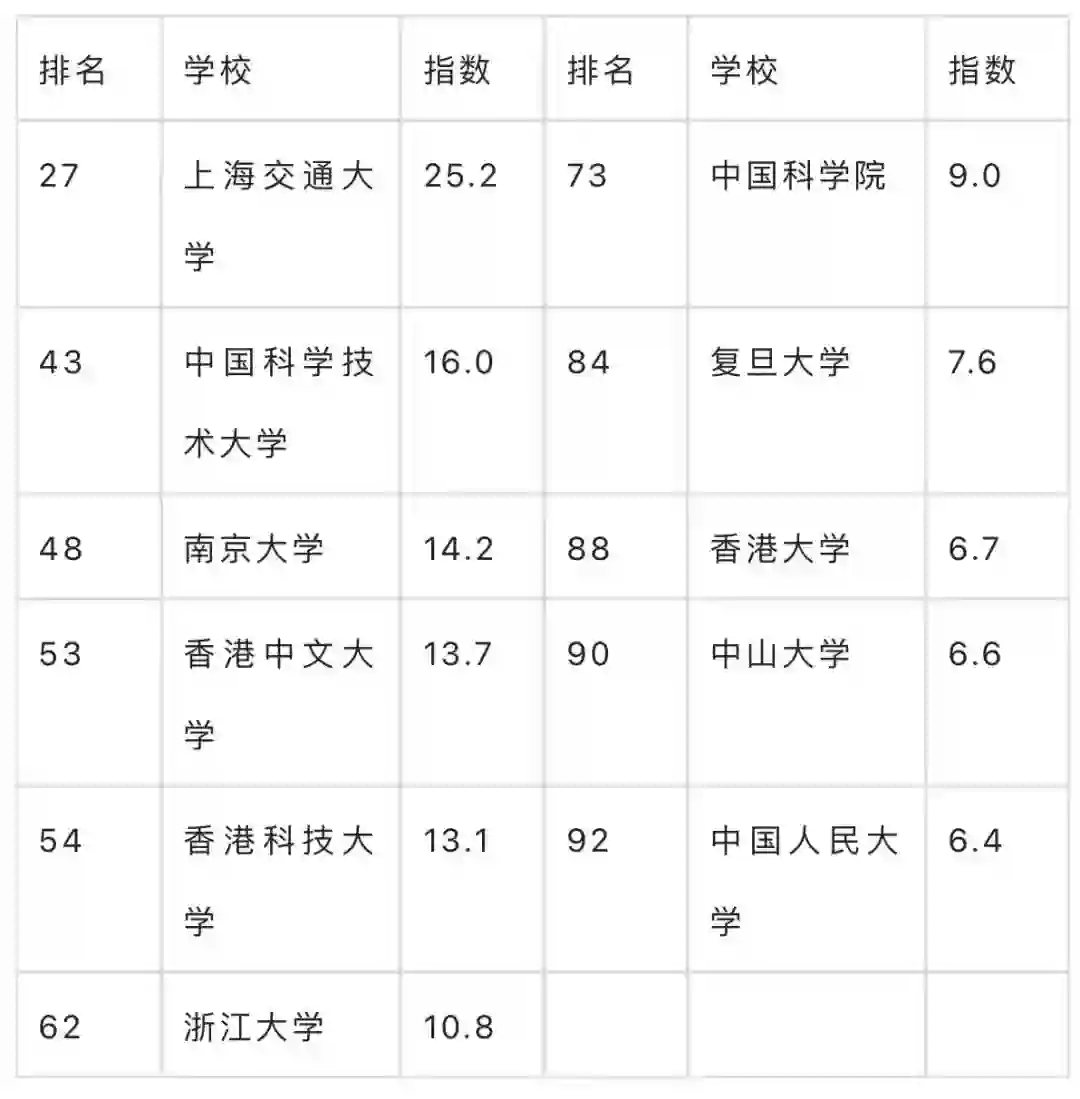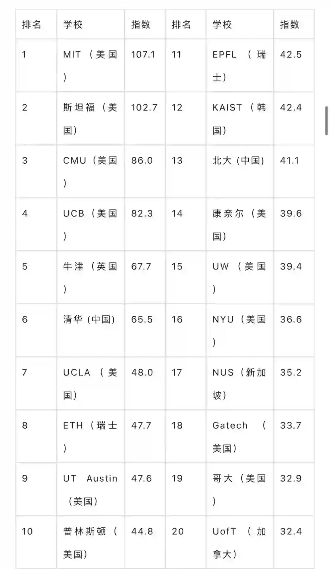 由于篇幅有限,在表格中只列全球前20个AI研究排名的大学。部分大学表格内是缩写(不一定严谨),后附全称。