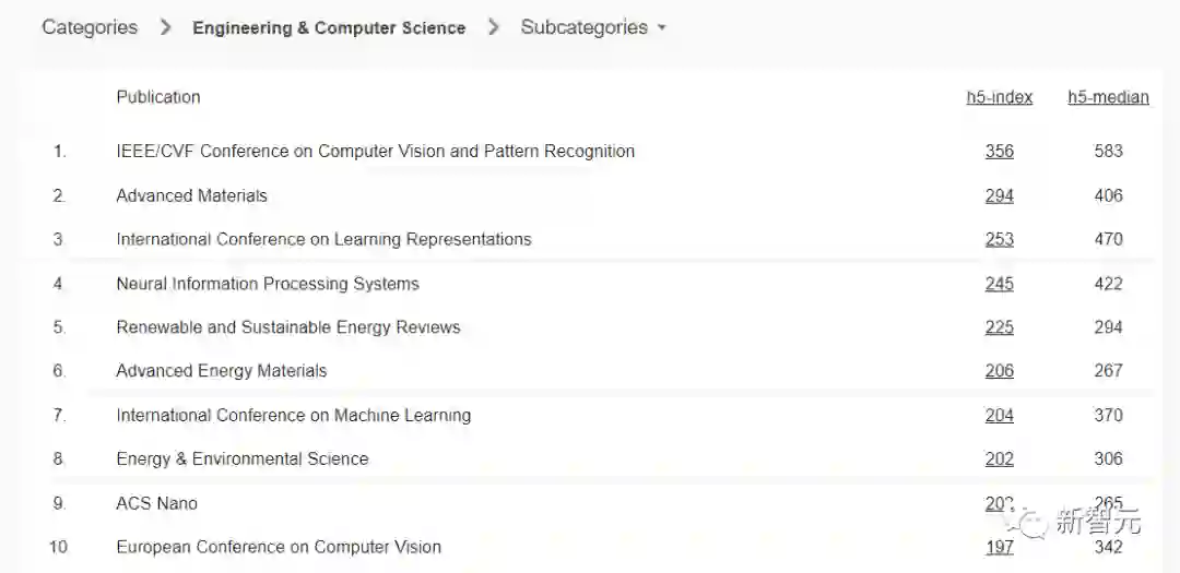 根据去年7月更新的谷歌学术指标( Google Scholar Metrics )对各行业顶会和期刊影响力的排名,NeurIPS和ICML和在「工程和计算机科学」类别中分别位列第4位和第7位。