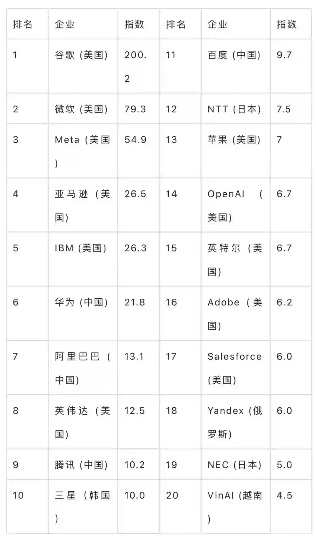 从直观的角度出发,谷歌的指数为200,可以解释为谷歌在2021年的这两个AI会议上发表了200篇完整的论文。
