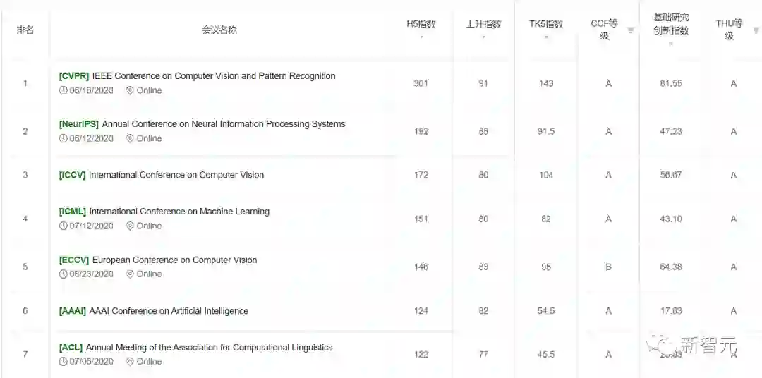 在中国计算机学会(CCF)发布的「中国计算机学会推荐国际学术会议和期刊目录」上,在人工智能子类别下共列出了7个A类会议,ICML和NeurIPS均榜上有名。