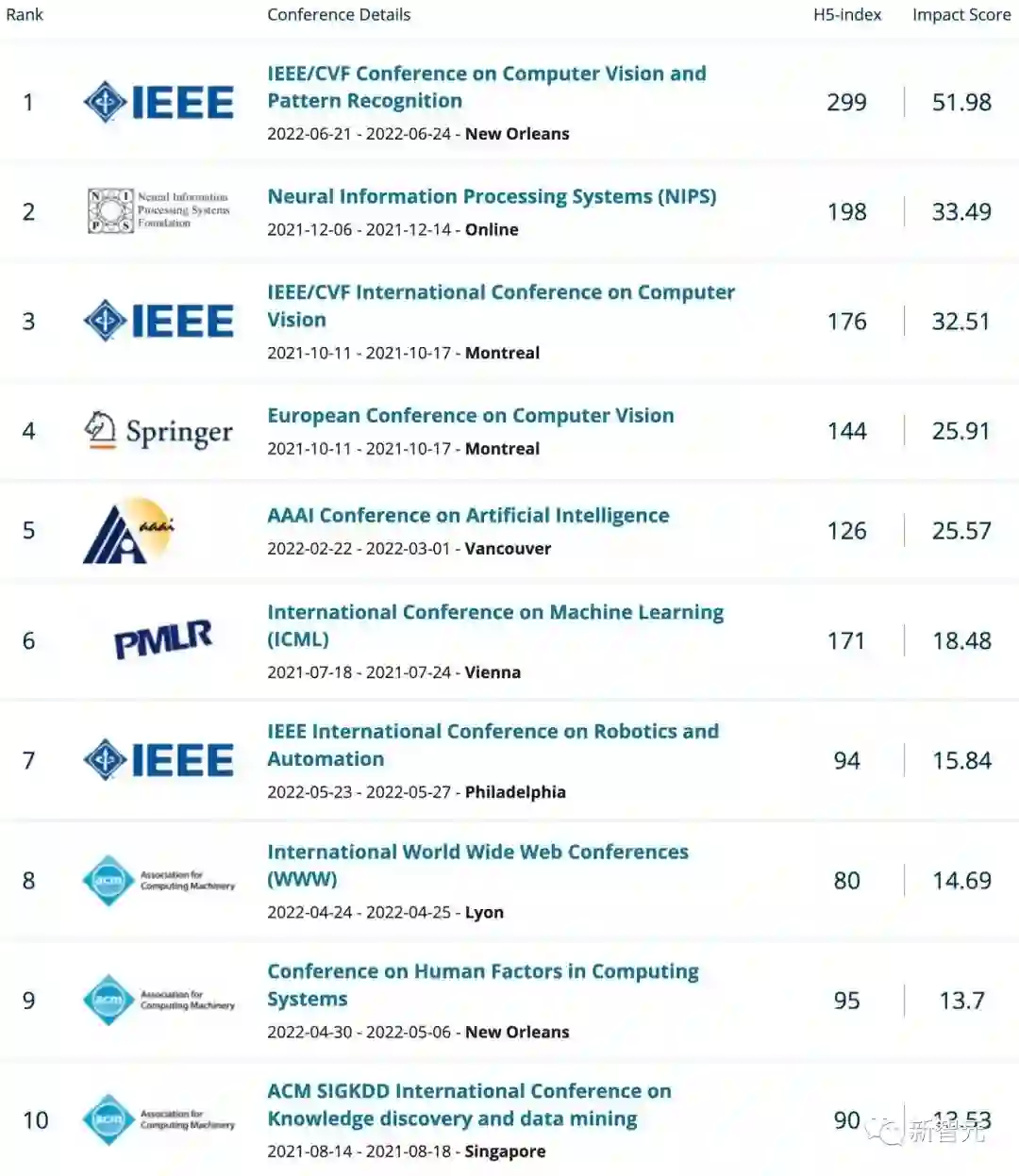 在清华AMiner对计算机科学顶会的排行榜上,结果也差不多。NeurIPS排名第2,ICML位列第4.