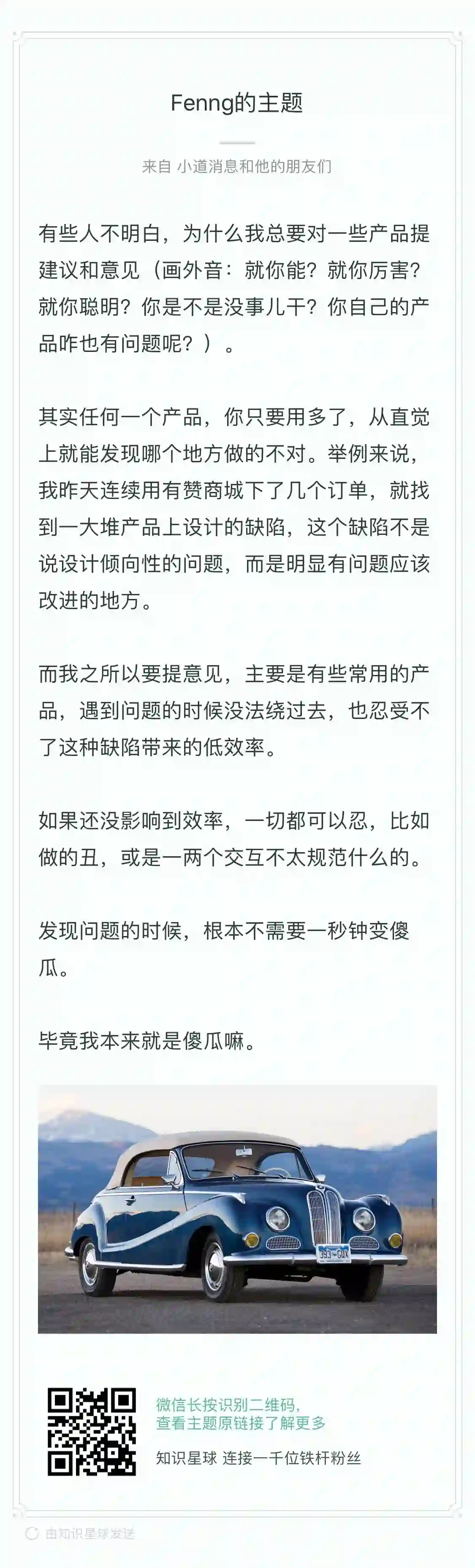 你以为只是广告?我在图片里阐述了内容。而且,提到了一个产品「有赞」,我是给有赞打广告?还是阐述了我对提建议这个行为的看法?