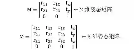 在 2 维平面中,我们加了 1 个维度 z,是为了方便完成平移操作。写出 2 维平面姿态矩阵 M 的一般形式,并延伸并类比到 3 维空间的姿态矩阵,表示如下: