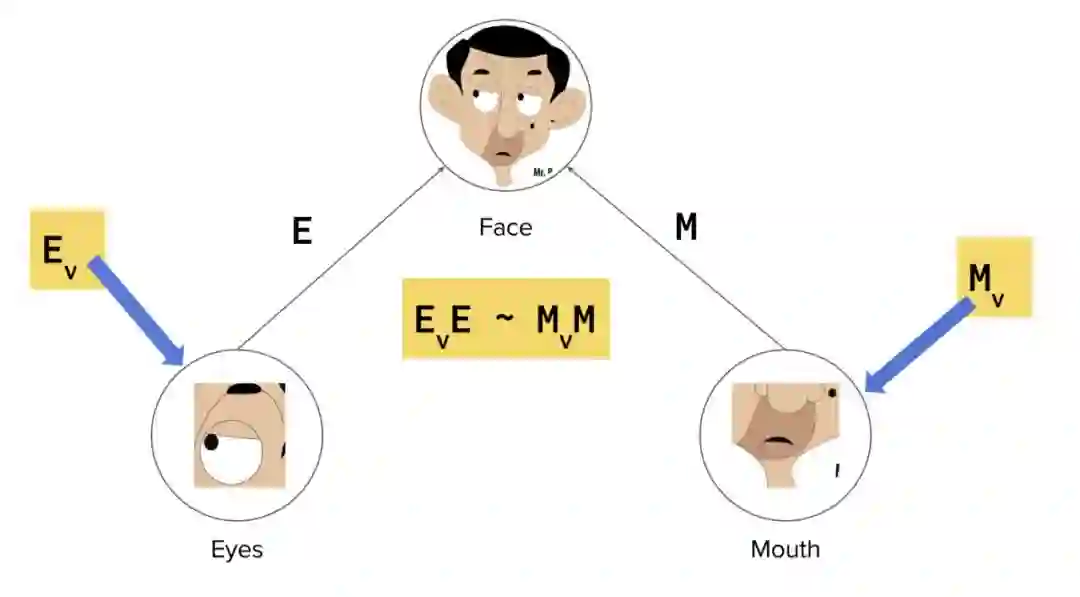 现在告诉你左眼的位置,你可以想象脸的位置了吧。同理,你以为可以从嘴的位置估计脸的位置。如果由左眼和嘴的位置推出脸的位置相符,数学上表示为 Ev·E = Mv·M,其中