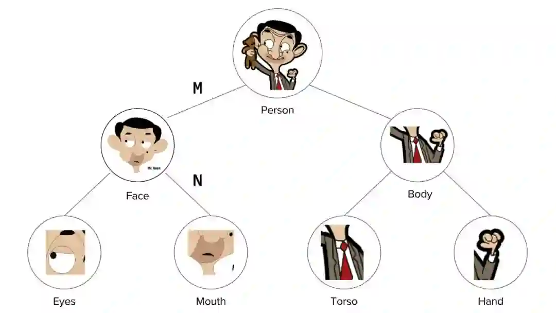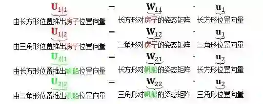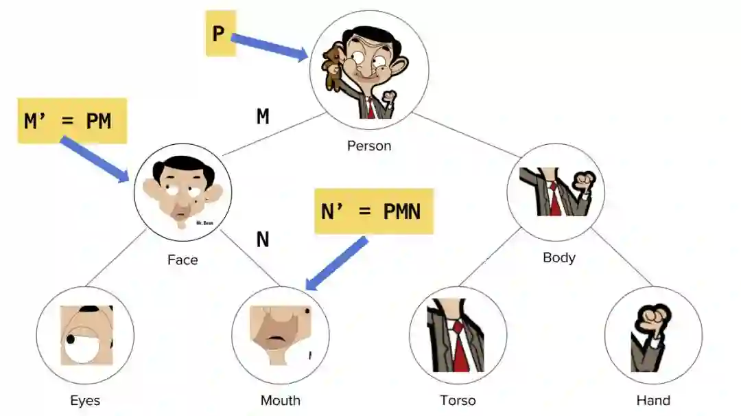 每个部分通过一个姿态矩阵与其主体相关联。如果 M 是脸对人姿态矩阵,N 是嘴巴对脸姿态矩阵,那么嘴巴对人的姿态矩阵为 N' = MN。