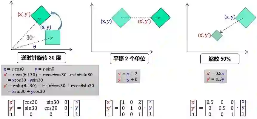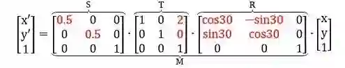 用 R, T, S 定义旋转、平移和缩放矩阵,那么将 (x, y) 先逆时针转 30 度,再向右平移 2 个单位,最后缩放 50% 到 (x', y') 可以由下列矩阵连乘得到