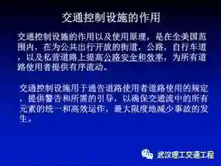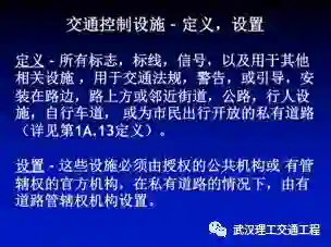交通控制设施有个定义就是,什么是交通控制设施,现在已经好多了,我几年前回来还问那个学生,我说你们说什么是交通控制设施?基本上十个有九个跟我说信号灯。其实交通工程设施一般来说分类就是标志标线信号灯这三大类,现在把这个交叉口路缘石也加在里面,但是那个还不真算,在这个交通控制设施里边,授权机构设置管辖范围。