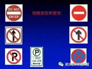 还有一个满足道路使用和管理,道路你怎么使用,是单向行驶,还是还可以停车,这个跟中国差不多了,这是国内的这个停车标志,这是美国的,美国当然也有红的,中国还没有这样的标志,这是允许停车的标志,允许你在这停一个小时,从早上7点到晚上6点允许你在这停一个小时,国内到现在还没有,因为一般比如你像咱们这个街道上小街小巷,那些小的这些商户,他希望人在这门口能停一会儿,但是又不能停长了,停长了影响另外的客户了。比如咱们那些卖快餐的,卖早点的,还有洗衣店,还有银行就希望你在这停一个小时之内,然后下一个客户来他还可以停。