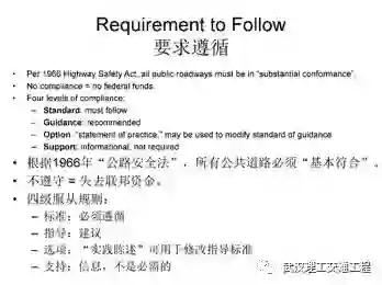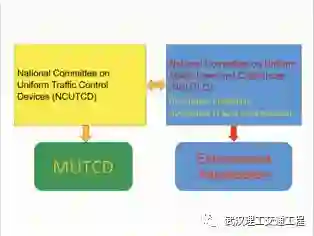 另外一边就是咱们做工程的人用的,从那一边下来就是到了统一交通工具手册MUTCD,两个内容是一定要一致的,比如说必须有红灯绿灯黄灯,但是这边是告诉你怎么执法的,怎么设置,这是两边的东西。