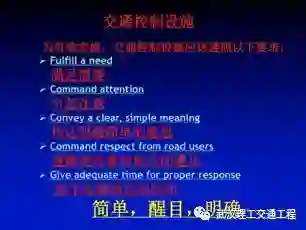 这五条是最关键的,包括兰州那个事故,一路上那些标志标线还是根据五条能做到,这五条看上去容易,并没有什么太复杂的话,第一个满足要求,第二个引起注意,第三个就是表达简单明确的意思,第四个道路使用者对指令的遵从,第五个反应时间,实际上就这么简单,这六个字,我就简单醒目明确,人一看就知道怎么回事。