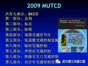 刚才徐老师实际上已经介绍了五大本东西,一本就是主要讲设计的绿皮书,这个MUTCD呢也是一大本,主要是操纵于道路的:道路怎么设计,限行怎么走,交叉口应该什么样,上下坡道弯道以及怎么交叉,什么等级的应该怎么走。MUTCD说的是路上边,路下边的不管,那个道路怎么走、排水实际上是不管的,这个美国分得很清楚。