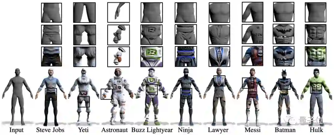 再比如下面这个,不管是变雪人、忍者、蝙蝠侠、绿巨人,还是乔布斯、梅西、律师……衣服的褶皱、配饰、肌肉、发丝……等细节都可以生动呈现。